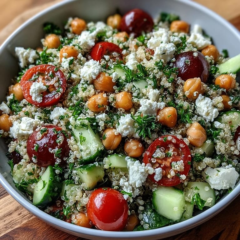 Pin This My neighbor showed up one afternoon with a container of this salad, still cold from her fridge. She'd made it for a potluck that got canceled and didn't want it to go to waste. I ate it standing at the counter, and by the time I reached the bottom, I'd already texted her for the recipe. The way the lemon clung to the quinoa and the feta melted just slightly into the chickpeas made it impossible to stop at one bite.