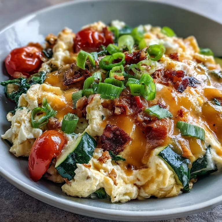 Pin This Start your morning with a vibrant Scrambled Egg and Veggie Bowl. This wholesome breakfast features fluffy eggs, colorful sautéed vegetables, and gooey melted cheese, providing a nourishing and delicious start to any day.